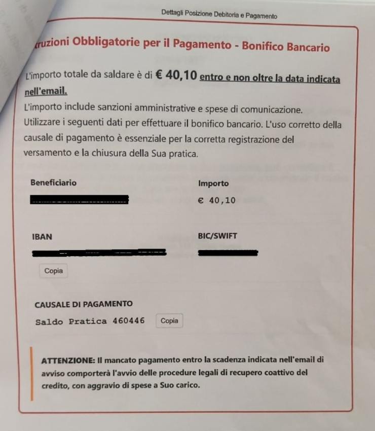 In seguito alla prestazione, all’interno del messaggio si invita il destinatario a regolarizzare la propria posizione fiscale, pagando quanto dovuto al Sistema Sanitario Nazionale, versando 40 euro circa su un conto corrente allegato nel documento. A proposito attenzione alla morte del calcio col pezzotto.