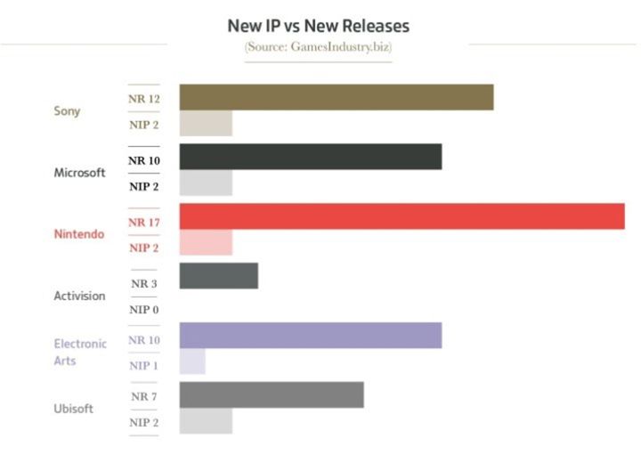Il numero massimo di nuove IP si ferma a 2, registrato da colossi come Ubisoft, Nintendo, Microsoft e Sony; EA raggiunge quota 1, mentre addirittura ferma a 0 Activision. I dati evidenziano nettamente una mancanza di coraggio da parte delle aziende e poca voglia di “osare”, di stuzzicare il pubblico con titoli ambientati in un mondo nuovo di zecca.