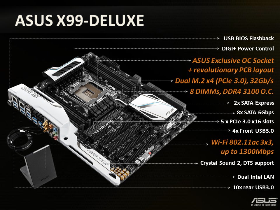 Le schede madri Asus X99 sono studiate per workstation professionali e sistemi end-level ad elevata stabilità ed affidabilità, ma dispongono comunque di caratteristiche analoghe alla ROG Rampage V Extreme, come l’OC Socket e il sistema di alimentazione Digi+, che garantiscono un ampio margine di overclock. Sono disponibili in tre versioni: la X99 DELUXE è la più accessoriata e dispone di connettività Wi-Fi 802.11ac integrata 3×3 (che può spingersi a velocità di 1300Mbps con router compatibili come RT-AC68U o RT-AC87U), 14 porte USB 3.0 e 6 USB 2.0, codec audio Crystal Sound 2 con supporto DTS, Dual LAN Intel Gigabit, 8 SATA III, 2 SATA Express e ben due Slot M.2 PCI-E x4 per installare gli SSD di nuova generazione (il secondo è installabile tramite l’apposito adattatore PCI-E fornito a corredo). Insomma una soluzione meno improntata al gaming ma con più funzionalità dedicate all’ambito professionale, in grado di garantire comunque prestazioni davvero eccellenti. Ecco di seguito le specifiche delle nuove schede madri Asus X99: