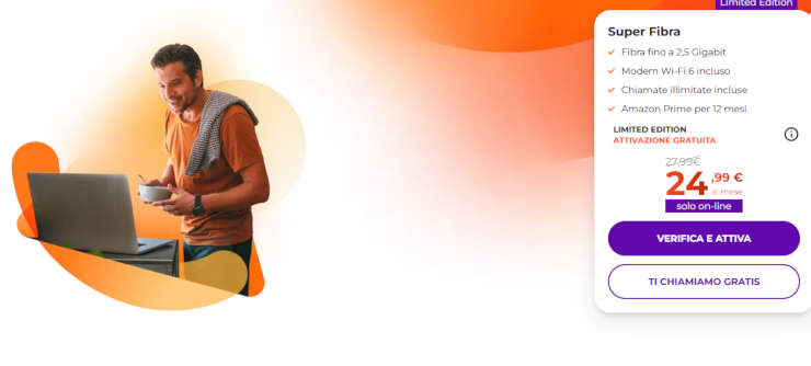 In limited-edition, ad esempio, Super Fibra è un’occasione se vuoi assicurarti una connessione Internet a casa da fare invidia a tutti i tuoi amici. L’offerta prevede modem Wi-Fi 6, chiamate illimitate, fibra FTTH (Fiber to the Home) fino a 2,5 Gigabit e Amazon Prime per dodici mesi.
