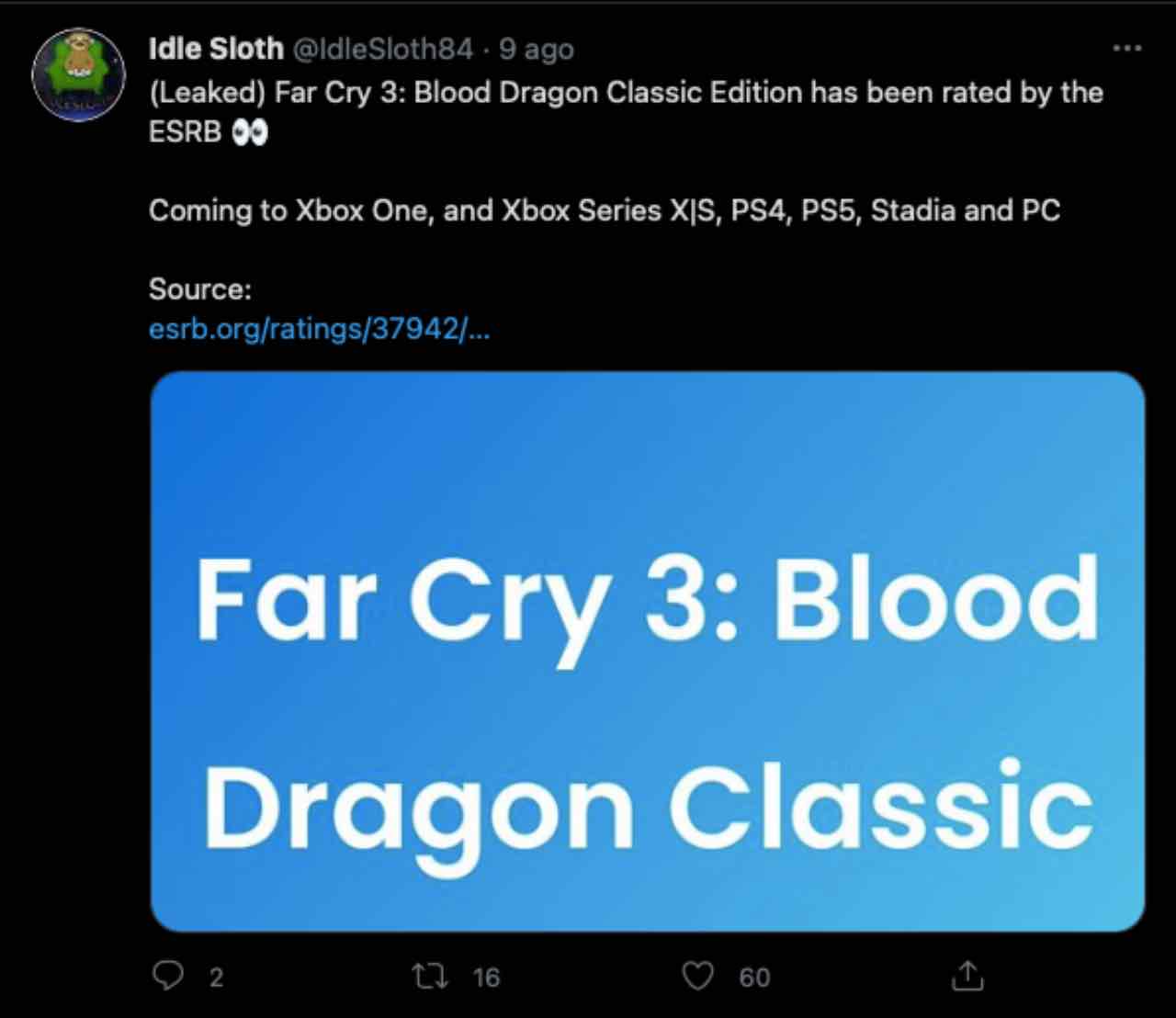 Non è possibile stabilire di che tipologia di gioco si tratti, se di una remastered come quella pubblicata qualche tempo fa per il terzo capitolo o di un’operazione più complessa. Tuttavia, grazie a un leak, si è potuto scoprire quali siano le piattaforme sulle quali sarà possibile giocare alla Classic Edition. Ma di quale titolo stiamo parlando? Si tratta di Far Cry 3 Blood Dragon: Classic Edition. Ancora in fase di preparazione si prepara al debutto su PC, PlayStation 4, PlayStation 5, Xbox One, Xbox Series X/S e Google Stadia.