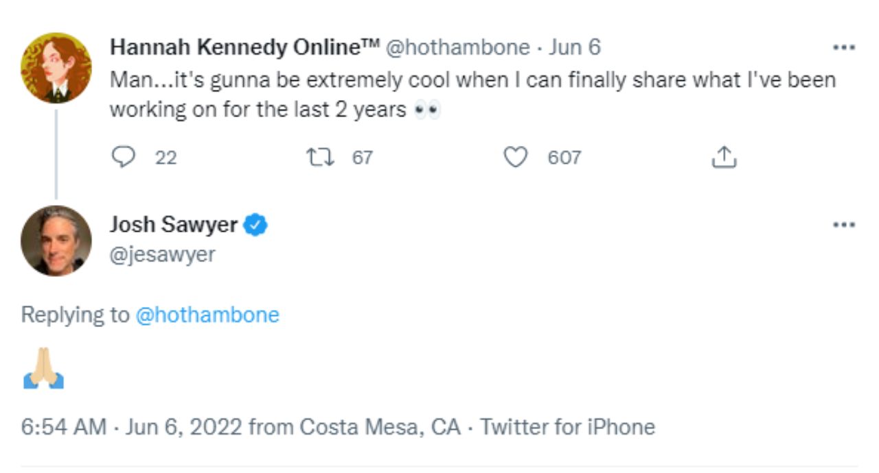 Qualcuno fa un’ipotesi in base non tanto al messaggio di Kennedy quanto alla risposta di Josh Sawyer, membro cardine del team Obsidian, che risponde con l’emoticon delle mani giunte. Potrebbe non significare nient’altro che un “Dammi il cinque” o potrebbe essere un’indicazione di quel progetto che va per ora sotto il nome in codice di Pentiment. Quello che è sicuro è che Obsidian in un modo o nell’altro sarà presente e molto probabilmente con qualcosa di assolutamente nuovo e che nessuno avrebbe potuto prevedere.