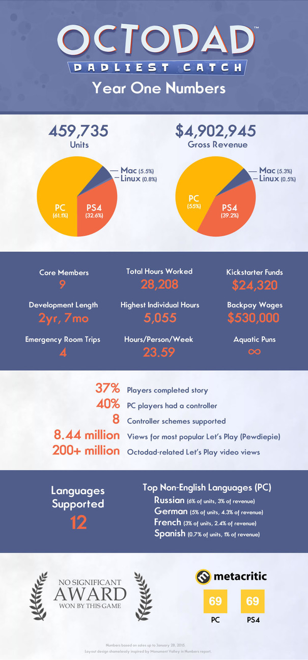 Il singolare gioco dedicato alle avventure di un polipo, Octodad: Dadliest Catch ha ottenuto un buon successo dal lancio, riuscendo a vendere 459.735 copie dallo scorso gennaio.