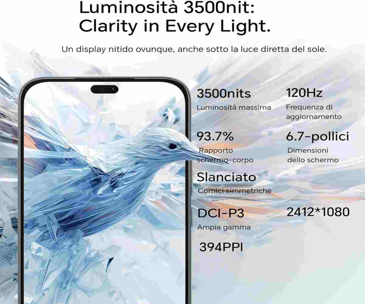 Sotto la scocca troviamo una CPU MediaTek Dimensity 7025 Ultra potentissima, che lavora insieme a 8 GB di RAM e 256 GB di memoria di archiviazione. Velocità e potenza senza limiti. Ottima anche la certificazione IP65 contro la polvere e l’acqua, di cui non dovrete più preoccuparvi in maniera eccessiva.