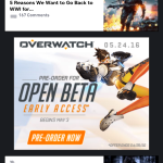 Come rivela un banner pubblicitario pubblicato sul sito IGN, Overwatch dovrebbe entrare in Open Beta il 3 maggio; effettuando il pre-ordine del gioco entro il 29 aprile l’accesso anticipato al gioco sarà garantito.