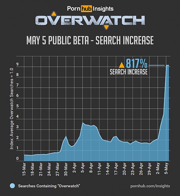 Ma per quanto riguarda gli altri parametri di successo? Ebbene, stando alle statistiche di Pornhub, le ricerche correlate allo sparatutto hanno visto una crescita dell’817%. Per chi non lo sapesse, Pornhub è un sito web dedicato a contenuti video per adulti. Il termine di ricerca più utilizzato (sempre correlato al gioco naturalmente) sarebbe stato “Overwatch Tracer”.