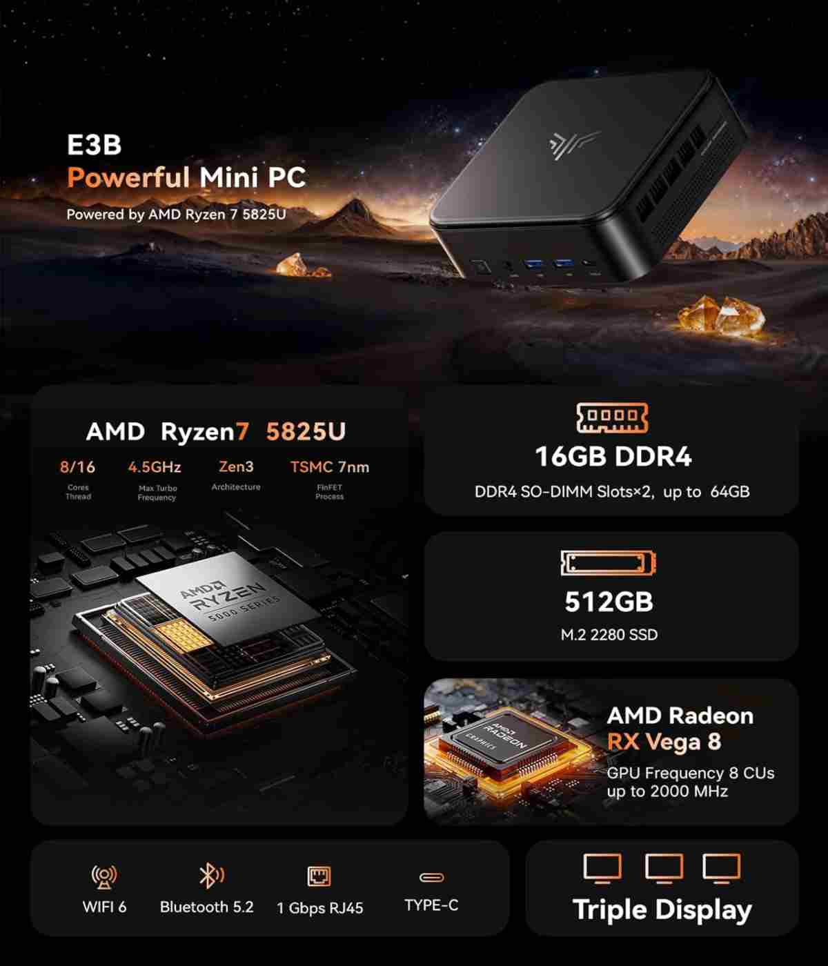 Per quanto concerne porte e connessioni, il pc vanta porte HDMI, DP e Type-C che supportano l’uscita a triplo schermo con risoluzione 4K UHD. Il Mini-PC E3B è dotato di Gigabit Ethernet, WiFi 6 e Bluetooth 5.2, quindi è una scheggia in termini di connessione e condivisione dei dati. Il dispositivo vi arriverà con la nuova versione di Windows 11 Pro già installata a bordo.