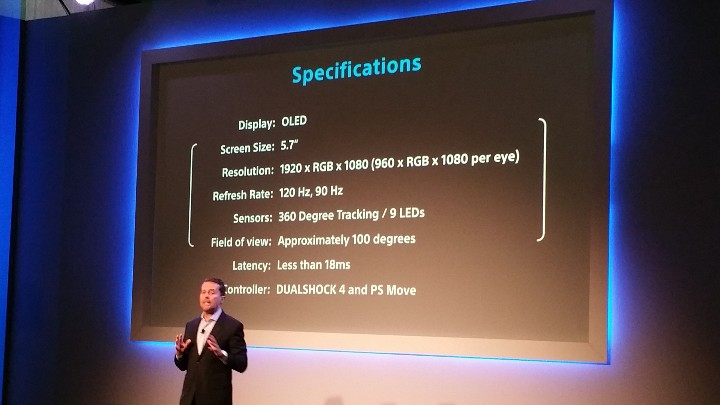 Diamo uno sguardo alle specifiche finali del visore per PS4. Playstation VR avrà un singolo display OLED da 5.7″ con risoluzione di 1920×1080 (960×1080 di risoluzione per ciascun occhio). E refresh a 90 o 120Hz. Offrirà un tracking a 360° dei movimenti della testa, grazie a 9 LED posizionali, “interpretati” da Playstation Camera. Mentre il field of view sarà di circa 100 gradi e la latenza di tracciamento inferiore ai 18ms. Si potrà utilizzare in abbinamento an Dualshock 4 o con Playstation Move e supporterà anche l’audio 3D posizionale, calcolato in base ai movimenti della testa dell’utente. Il design del visore, rispetto ai prototipi è stato ottimizzato per migliorare comfort ed ergonomia. La singola fascia di contenimento e un pulsante di rilascio rapido renderanno facile per tutti gli utenti indossarlo e rimuoverlo. Il design è futuristico, ma fedele ai canoni di Playstation. Il peso complessivo sarà di 610g (escluso il cavo).