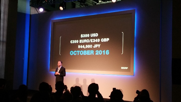 Playstation VR verrà lanciato ad ottobre in tutto il mondo, ad un prezzo di 399 $ negli USA, 399 euro in Europa, 349 GBP in UK e 44.980 Yen in Giappone. La confezione conterrà, oltre al visore, il box “Unità processore”, un cavo di collegamento per visore, un cavo HDMI, un cavo USB, auricolari stereo, cavo di alimentazione e alimentatore. Mentre non sarà inclusa Playstation Camera, comunque necessaria al suo funzionamento e il cui costo, al momento è di circa 60 €. Il software The Playroom VR sarà invece scaricabile gratuitamente da Playstation Store per tutti i possessori di Playstation VR.