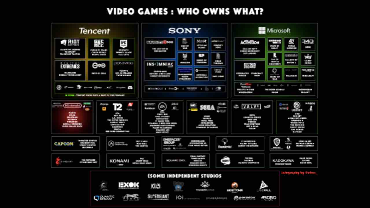 Prima di tutto, nel grafico, si vede come l’acquisizione di Xbox di Activision Blizzard sia stata finalizzata a tutti gli effetti. Invece dobbiamo dire che, ancora, il percorso per arrivare ad una situazione del genere è molto lungo. Ma non è l’unica cosa. Tra i publishare pubblicati c’è anche PlayStation Japan, che ci ricordiamo molto bene essere stata chiusa da Sony. Inoltre, solo una piccola parte delle azioni di Epic Games fanno parte di Tencent.