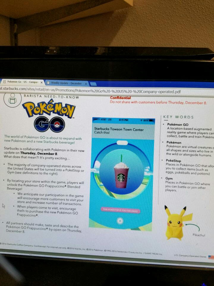 Nel documento trapelato c’è scritto che il gioco sta per espandersi con nuovi mostri questo Giovedì, 8 dicembre, senza però scendere nei particolari. La compagnia introdurrà anche un frappuchino a tema Pokémon, mentre tutti i negozi Starbucks diventeranno PokéStops.