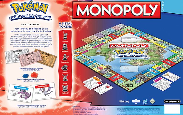 Il gioco prende il nome di “Pokémon Monopoly Kanto Edition” ed è già disponibile per il pre-order sul sito Gamestop. Sfortunatamente per ora sarà disponibile solo in Nord America, al prezzo di circa 45 Dollari (circa 33 Euro). Il gioco è caratterizzato da un tabellone che rappresenta la regione di Kanto (comprensiva delle palestre) oltre a sei pedine da collezione raffiguranti i famosi Bulbasaur, Pikachu, Squirtle, Eevee, Charmander e il tenero Jigglypuff. Le case e gli alberghi del gioco originale, infine, sono stati sostituiti da Pokémon Center e Pokémon Market.