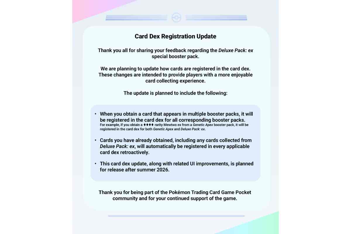 “Questi cambiamenti hanno lo scopo di fornire ai giocatori un’esperienza di collezione di carte più piacevole“. E del resto, dato che Pokemon Pocket TCG altro non dovrebbe essere che la versione virtuale del gioco di carte più tradizionale legato ai Pokemon, più di qualcuno sottolinea come fosse ora che effettivamente i developer si concentrassero sull’aspetto del collezionismo.