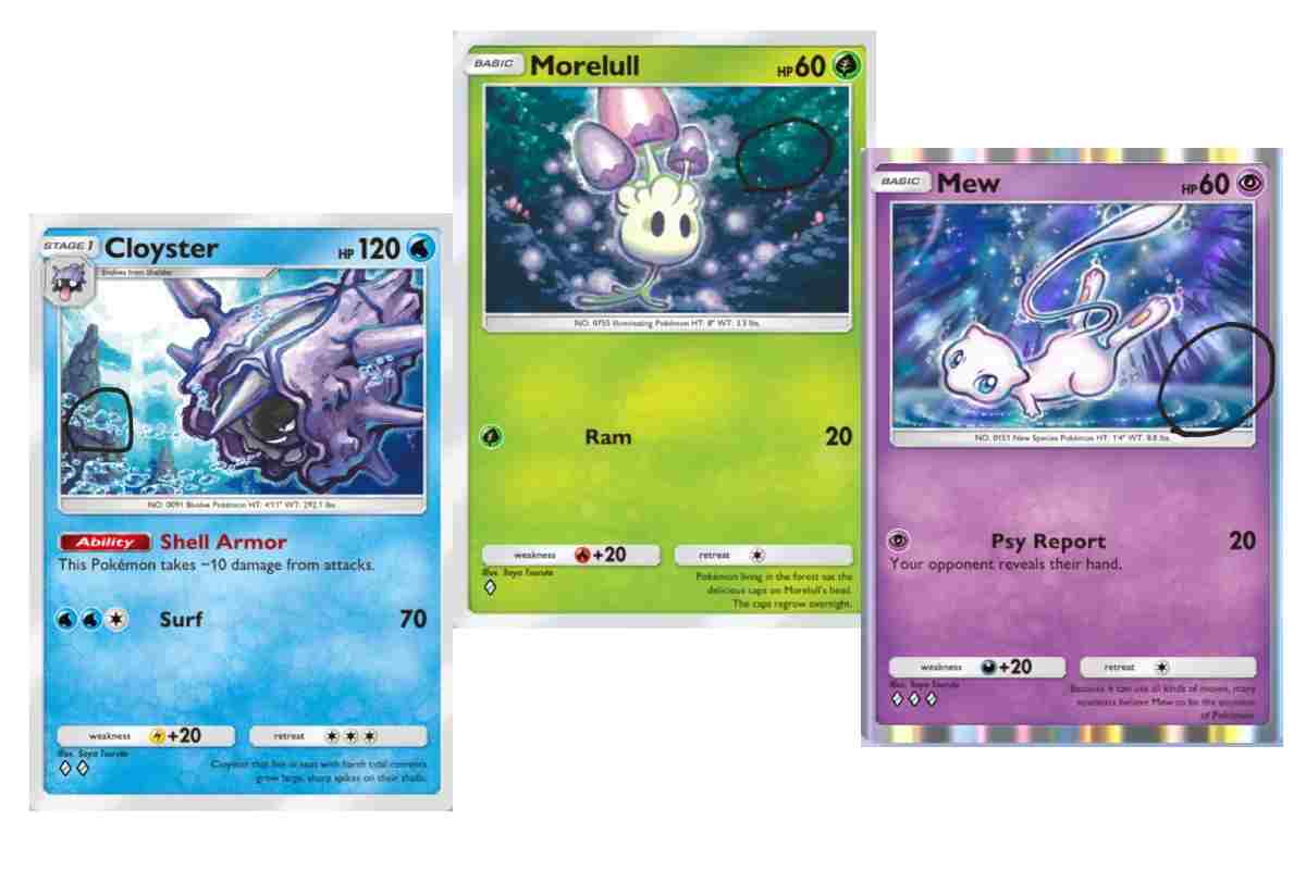 Guardando da vicino per esempio le sue elaborazioni della carta di Morellul oppure Mew ci si accorge che, sullo sfondo, in un angolo, in una posizione un po’ strana c’è sempre rappresentata una Poké Ball. In alcune carte assomiglia ad una bolla di sapone, in altre carte sembra un riflesso di qualche superficie.