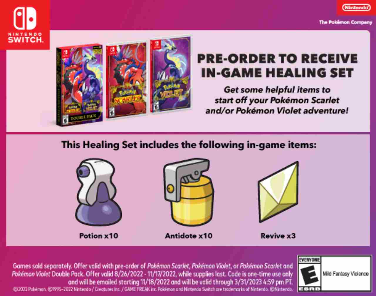 Tutto è iniziato con un post destinato proprio ai fan dei mostriciattoli da taschino. Se ci limitassimo a guardare il testo non sarebbe di certo una scelta malvagia: “Prenota Pokemon Scarlatto, Pokemon Violetto oppure il Double Pack Pokemon Scarlatto e Violetto e ricevi un codice di download per un Healing Set esclusivo“. Solo che poi l’immagine che chiarisce cosa c’è effettivamente nel set mostra dieci Pozioni, dieci Antidoti e tre Resuscita. Di certo non il massimo per un Healing Pack esclusivo.
