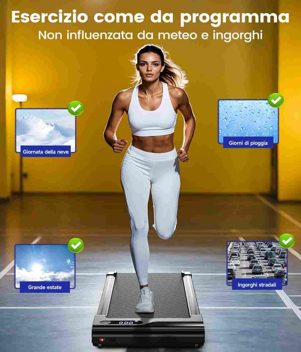 Ci sono 4 velocità regolabili: camminata, camminata veloce, jogging e corsa. Il nastro antiscivolo a 5 strati con trama diamantata, ammortizzatori in silicone e cuscinetti in gomma riduce i danni alle ginocchia. Inoltre è possibile controllare tutto con un display LED posto sul dispositivo.