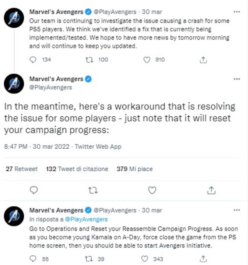 Come scritto sull’account ufficiale di Marvel’s Avengers, al momento viene consigliato ai giocatori che incontrano questo bug di ricominciare da zero la campagna, cancellando il vecchio salvataggio. “Andate in Operazioni e resettate i progressi della campagna Reassemble. Appena diventi la giovane Kamala in A-Day”, scrivono gli sviluppatori, “chiudi forzatamente il gioco dalla schermata iniziale di PS, poi dovresti essere in grado di iniziare Avengers Initiative”. Purtroppo però il procedimento “cancella tutti i progressi della campagna“. Sotto il tweet si sprecano i commenti di videogiocatori delusi e arrabbiati, che sottolineano come ripartire da zero non sia proprio una vera soluzione al problema.