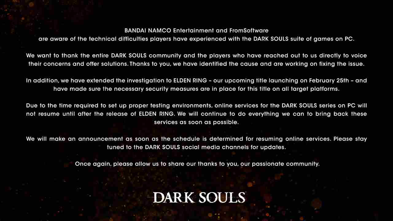 Ma, probabilmente in quello che qualcuno potrebbe definire un eccesso di cautela e che a noi sembra invece la scelta migliore da fare, nel messaggio viene sottolineato come l’indagine riguardo questa possibile falla nella sicurezza sta proseguendo anche proprio dentro Elden Ring e che i server di Dark Souls torneranno funzionanti solo in un momento successivo alla pubblicazione del gioco, per permettere così a chi si occupa di questo pericolosissimo bug di lavorare in tranquillità. Non è quindi scontato che i server di Dark Souls tornino attivi il 25 febbraio prossimo, data di uscita scelta per il nuovo gioco FromSoftware e Bandai Namco.