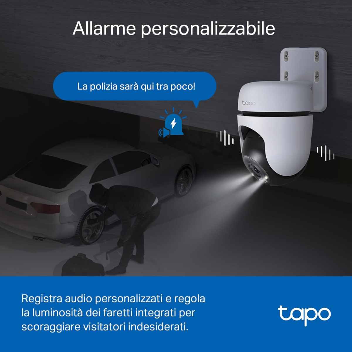 Attraverso una costruzione intelligente e rotori di alta qualità, questa telecamera Tapo per esterni può ruotare di 360° su se stessa e in verticale di 130°, offrendo una copertura totale della zona interessata.