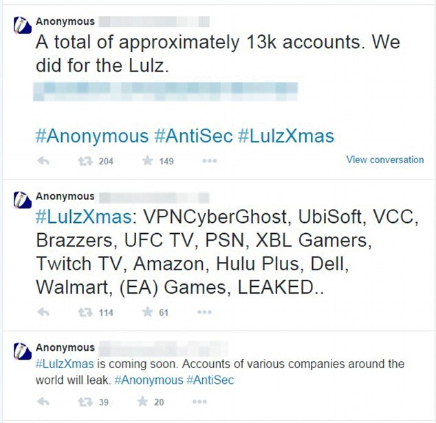 Il gruppo responsabile dell’attacco sembrerebbe in qualche modo associato al popolare team Anonymous, ma non ci sono certezze che questo sia vero. In ogni caso i messaggi apparsi su Twitter sono piuttosto chiari: “Un totale approsimativo di 13k di account. Lo abbiamo fatto per il Lulz“. Quindi è il divertimento lo scopo dietro a questi gesti, esattamente la stessa cosa dichiarata da Lizard Squad. Mentre ci chiediamo cosa ci sia di poi tanto spassoso nel pubblicare password e dati sensibili online, notiamo un altro tweet con il tag molto natalizio “#LulzXmas”, dove viene pubblicata una lista di siti vittima dell’attacco: VPNCyberGhost, UbiSoft,VCC, Brazzers, UFC TV, PSN, XBL Gamers, Twitch TV, Amazon, Hulu Plus, Dell, Walmart, EA Games.