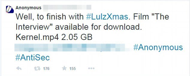 L’ultimo tweet riguarda invece il film The Interview (diventato popolare prima della pubblicazione a causa delle minacce ricevute da Sony) reso disponibile illegalmente in modo da sabotare la presenza di spettatori paganti nelle sale: “Bene, per finire con il #LulzXmas il film The Interview è disponibile per il download“.