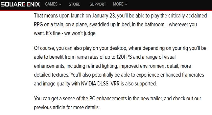Tornando serio però il comunicato di Square ci ricorda che ovviamente potremo anche giocare il titolo stando comodamente seduti alla scrivania e beneficiare di aggiornamenti importanti come lo sblocco fino a 120 FPS del videogioco, illuminazione e texture migliorate e supporto al VRR e al Nvidia DLSS per Final Fantasy VII Rebirth.