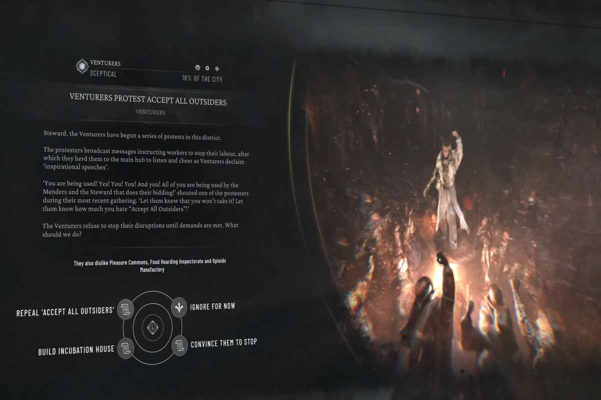 Rispetto al primo titolo qui ci sono molte più fazioni che si faranno guerra a distanza, e certe volte neanche, per influenzare il più possibile il futuro della città e le decisioni che prenderemo. Appoggiando o condannando un gruppo, rubandogli risorse o accettando le sue richieste, influenzeremo non solo i nostri rapporti ma anche il peso di quella enclave sul potere politico della città.