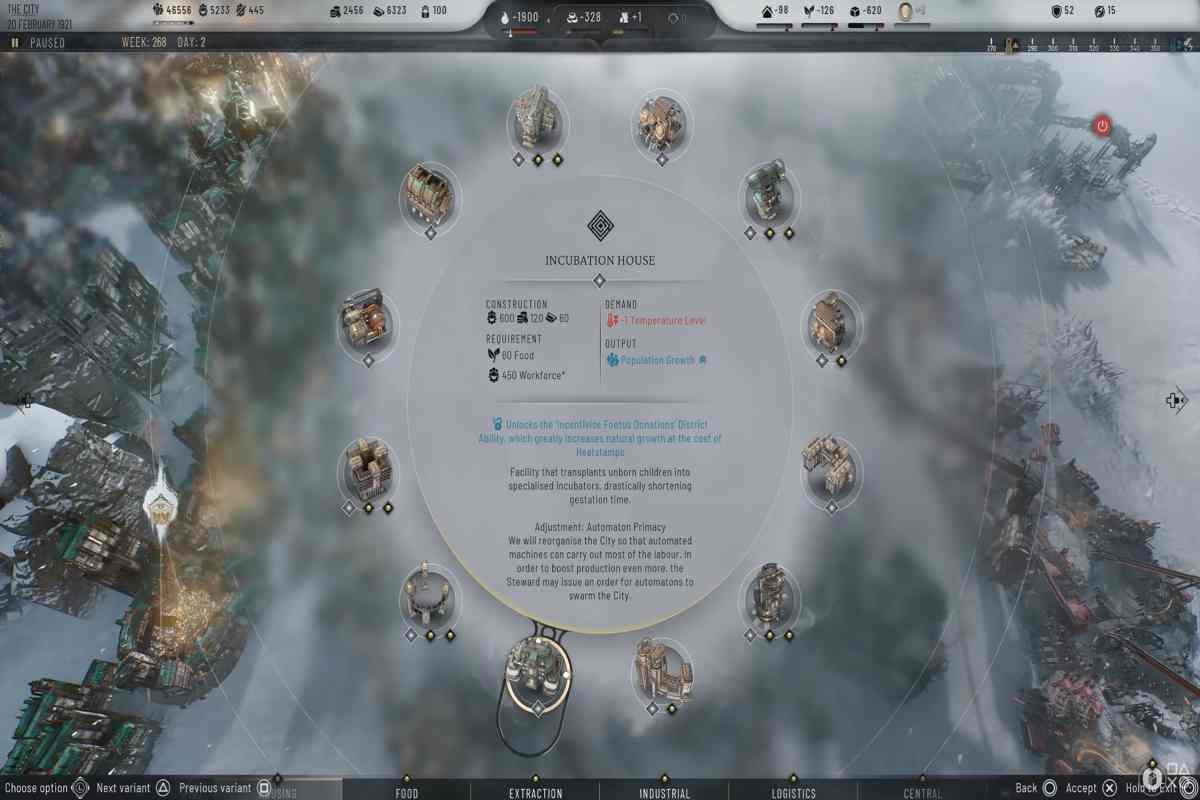 Il problema vero di Frostpunk 2 per console sono i comandi: sembra un altro gioco. Non era facile adattare questo titolo strategico su un pad, non lo è per nessuno, da Age of Empires a Crusader Kings 3. Ma il fatto è che la navigazione dei menu è veramente difficile e poco intuitiva, spesso le interfacce si buggano, non sempre l’indicatore finisce nella sezione giusta dei menu e in alcuni casi ho dovuto chiudere tutto e ricominciare sperando si sbloccasse.