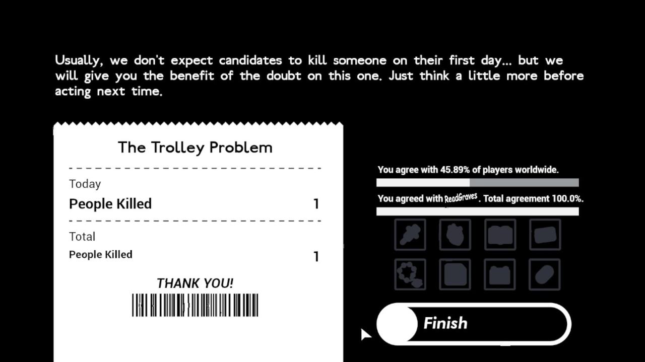 Bisogna essere molto chiari con se stessi, The Trolley Problem Inc non è certamente un titolo che vi sorprenderà dal punto di vista tecnico, qualitativo o narrativo. Le schermate sono incredibilmente semplici e ricordano più un gioco per smartphone che un gioco per PC. Ma, malgrado tutto ciò, i vari capitoli scorrono meravigliosamente, anche grazie ad una voce narrante che è davvero piacevole da sentire. Consigliamo di giocarlo con degli amici, per prendersi in giro con una birra in mano, o per dare inizio a grandi conversazioni filosofiche insieme ad whisky di qualità.