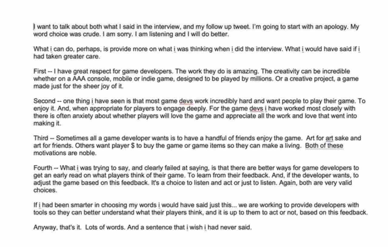 La frase incriminata che ha fatto salire sugli scudi una valanga di utenti Twitter in particolare ma anche acceso grandi discussioni su reddit è la seguente: “Ferrari e altri produttori di auto di alto livello utilizzano ancora la creta e lo scalpello. C’è una porzione molto piccola dell’industria dei videogiochi che lavora nello stesso modo e alcune di queste persone sono quelle che preferisco al mondo: sono le persone più meravigliose, pure e brillanti. E sono anche tra i più grandi idioti“. Il riferimento è ai developer che guardano ancora di sottecchi l’idea di avere e parlare apertamente di monetizzazione e conversione nei propri prodotti prima o contemporaneamente agli aspetti creativi e di gioco.