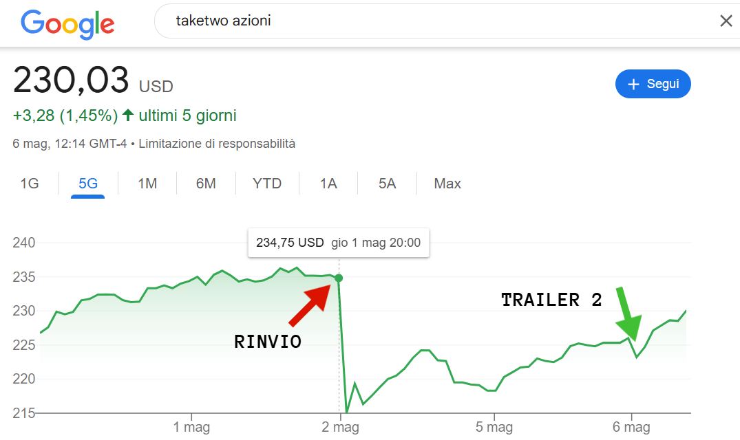 Il primo è rassicurare tutti. Dopo un rinvio di un anno per un titolo così costoso e già in sviluppo da anni, ecco che in tanti stavano già pensando al peggio. Take-Two era crollato in borsa e senza dubbio gli azionisti dietro le quinte dovevano star facendo pressioni. Con un trailer, il publisher ricorda a tutti che GTA VI esiste, che è potente e che tutti ne vogliono di più. E infatti ora il titolo è in netta risalita.