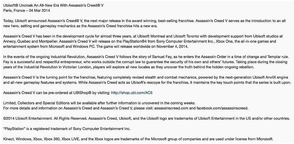 Un utente di Reddit, Shadesta9, sostiene di aver messo le mani su un comunicato stampa di Ubisoft, che secondo lui dovrebbe essere divulgato il 4 marzo 2014 e nel quale verrà annunciato il nuovo capitolo della saga di Assassin’s Creed. Il titolo sarà Assassin’s Creed V e il gioco sarà ambientato durante gli ultimi anni della rivoluzione industriale, nella Londra Vittoriana. Assassin’s Creed V secondo il comunicato (che trovate di seguito sotto forma di immagine) introdurrà un nuovo eroe, una nuova ambientazione e nuove meccaniche di gameplay. L’eroe si chiamerà Samuel Fey ed entrerà nell’ordine degli Assassini in un periodo di grandi cambiamenti e di forte dominio da parte dei Templari. Fey è un imprenditore molto rispettato, che lavora onestamente per garantire un futuro alla propria famiglia. I giocatore nei suoi panni potranno esplorare la città e mettere a nudo la verità che si cela dietro ad una misteriorsa rivolta. Si trattera di un punto di svolta nel franchise, con meccaniche stealth e di combattimento completamente riprogettate e un nuovo engine grafico AnvilX. Ci saranno grandi novità a livello di gameplay, mantenendo però le basi che hanno reso celebre la serie. Il titolo sarebbe in sviluppo da circa 3 anni presso gli studi di Ubisoft Montreal e Ubisoft Toronto, con il supporto degli studi di Annecy, Quebec e Montpellier. E dovrebbe uscire su PS4, Xbox One e PC il prossimo 4 novembre. Quindi niente console “current gen” e niente WiiU. Sarebbero previste anche edizioni Limited, Special e Collector di Assassin’s Creed 5, che verrranno annunciate successivamente. Ricordate che si tratta solo di un rumor!! Quindi non resta che attendere eventuali comunicazioni da parte di Ubisoft. In fondo il 4 marzo non è lontano…