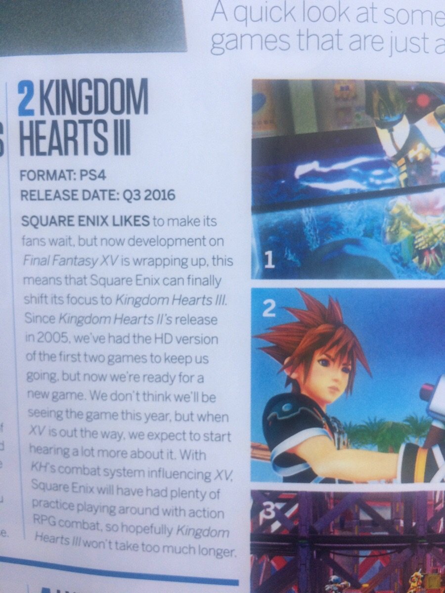 Se dovesse dire il vero, è probabile che Kingdom Hearts III verrà distribuito tra luglio e settembre del prossimo anno, in modo tale da essere una presenza dominante nel periodo autunnale e in quello natalizio del 2016, come lo furono i precedenti due capitoli nel 2002 e nel 2005.
