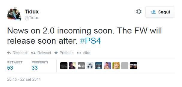 Tidux su Twitter- -News on 2.0 incoming soon. The FW will release soon after. #PS4- 2014-09-23 15-04-30