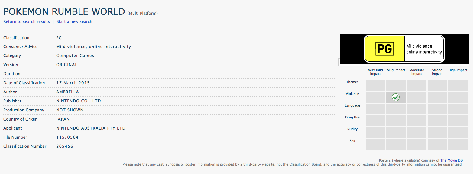 Nel frattempo, Nintendo Australia avrebbe registrato il marchio di Pokémon Rumble World, che presenterebbe la funzionalità online e sarebbe destinato a più piattaforme, almeno secondo quanto emerso dalla classificazione dei contenuti (come potete vedere nell’immagine seguente).