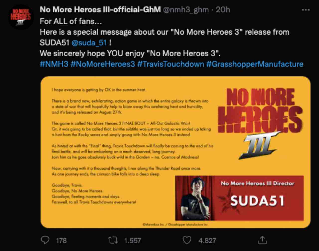 Il CEO rivela inoltre che questo, come già accennato in precedenza, sarà la fine della battaglia. In occasione dell’uscita del videogioco avvenuta il 27 agosto, Suda spera che tutti i giocatori possano ottenere la miglior esperienza divertente ed interessante nel corso della battaglia finale. In quest’occasione lo sviluppatore ha voluto anche ringraziare tutti i fan che da sempre gli hanno rivolto dei messaggi carichi di affetto.