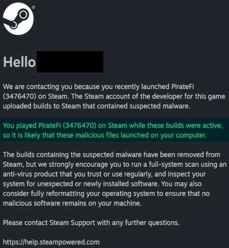 “Hai giocato a PirateFi (3476470) su Steam mentre queste build erano attive, quindi è probabile che questi file dannosi siano stati lanciati sul tuo computer”, si legge in una email che Valve sta mandando a tutti quelli che hanno installato questo prodotto per avviare tutti. A proposito di PC occhio a non farvi bruciare casa con questa componente.