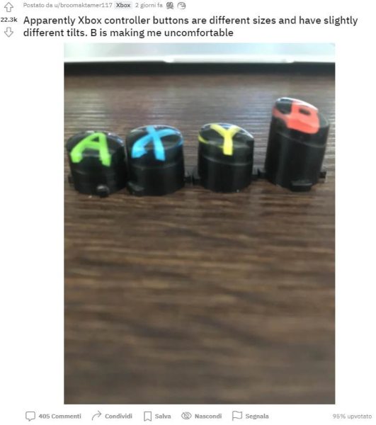 Invece per quanto riguarda il controller Xbox le cose sono leggermente diverse! Infatti un post su Reddit ha praticamente spopolato, portando centinaia di risposte e commenti oltre a 20.000 voti! Nel post in questione viene dimostrata la grandezza dei vari tasti del nuovo pad Xbox, e la cosa ha stupito molti poiché la differenza tra alcuni di essi è evidente.