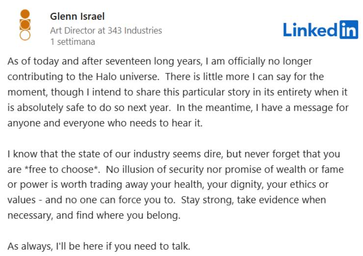 Glenn Israel ha annunciato la sua partenza da Xbox e dalla serie Halo su LinkedIn. “A partire da oggi, dopo diciassette lunghi anni, non contribuirò più ufficialmente all’universo di Halo”, scrive. “Per il momento non posso dire molto altro, ma intendo condividere questa storia nella sua interezza quando sarà assolutamente sicuro farlo, il prossimo anno”.