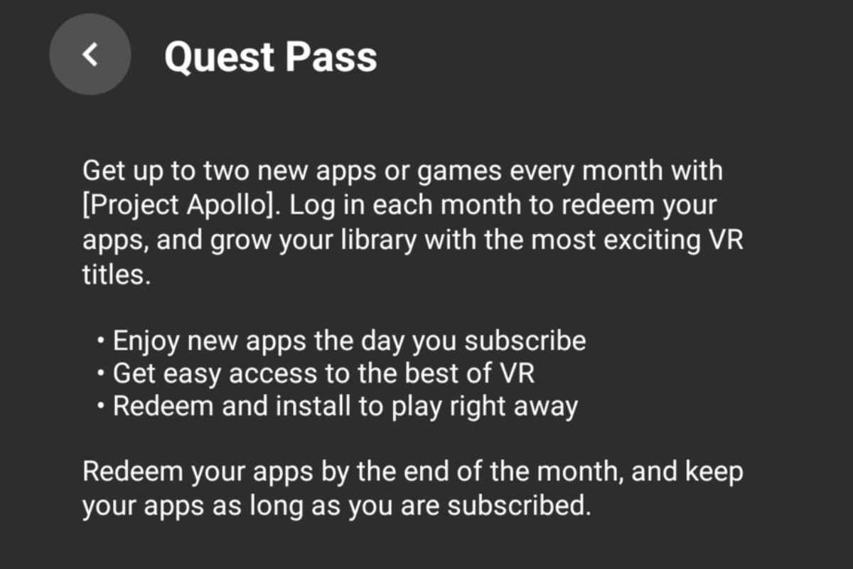 Quello che l’utente Twitter ha postato è una immagine che sembra rimandare ad una pagina interna dell’app mobile Oculus per dispositivi Android. Il messaggio parla di due nuove app o giochi ogni mese con qualcosa che viene definito “Project Apollo”. Il resto del messaggio somiglia molto alla pubblicità che per esempio si trova per il Game Pass e per PS Plus: “fai login ogni mese per riscattare le tue app e ingrandisci la tua biblioteca con i titoli VR più entusiasmanti“.