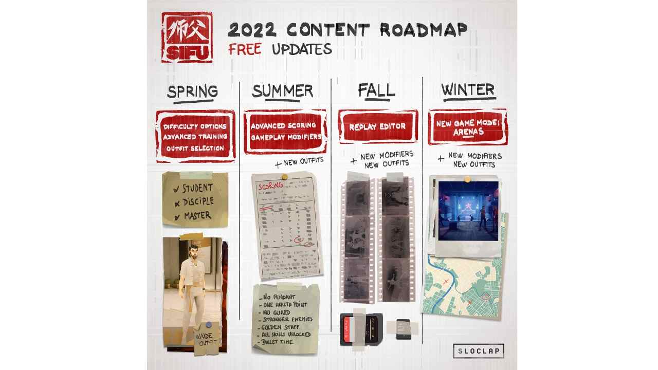 L’aggiornamento gratuito di primavera conterrà la possibilità di scegliere tra diversi livelli di difficoltà, il training avanzato e più outfit tra cui scegliere. Nuovi outfit verranno poi aggiunti anche con i successivi aggiornamenti sempre gratuiti. Per quello che riguarda i livelli di difficoltà ci sarà la possibilità di scegliere tra: studente, discepolo e maestro. Nel prossimo update, quello in arrivo in estate, ci sarà lo scoring avanzato e alcuni modificatori del gameplay per rendere Ancora più interessante la sfida che Sifu rappresenta. potrete, per esempio , decidere di rendere tutto più complicato con l’impossibilità di parare i colpi, oppure decidere di avere nemici più forti del normale o addirittura giocare senza il vostro pendente.