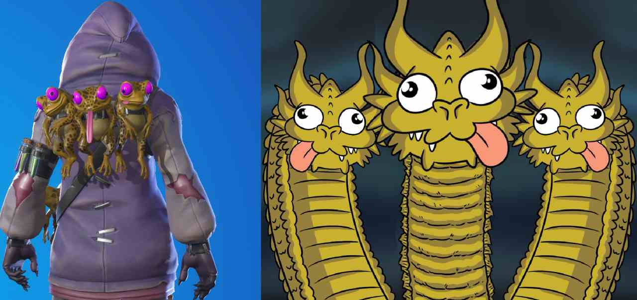 Stavolta è stato un utente di reddit ad essersi reso conto che forse chi si occupa di creare le skin di Fortnite ha guardato un po’ troppi meme. Nel sub forum dedicato al gaming l’utente mlights999 ha pubblicato una immagine con il retro di una skin e il meme con i tre draghi a cartone animato con la lingua di fuori. Ad una prima impressione non sembra esserci nulla di simile ma, esaminando un po’ meglio l’immagine, anche se stiamo parlando della skin Big Mouth dell’anno scorso, è evidente come la disposizione e l’espressione delle tre ranocchie che è possibile avere sulla schiena a mo’ di zainetto gracidante ricordi parecchio da vicino la disposizione e l’espressione altrettanto sveglia dei tre dragoni del meme. Potrebbe essere un caso, potrebbe essere stata veramente una pesante ispirazione. Sta di fatto che non è la prima volta che ci troviamo a fare discorsi del genere e probabilmente non sarà neanche l’ultima.