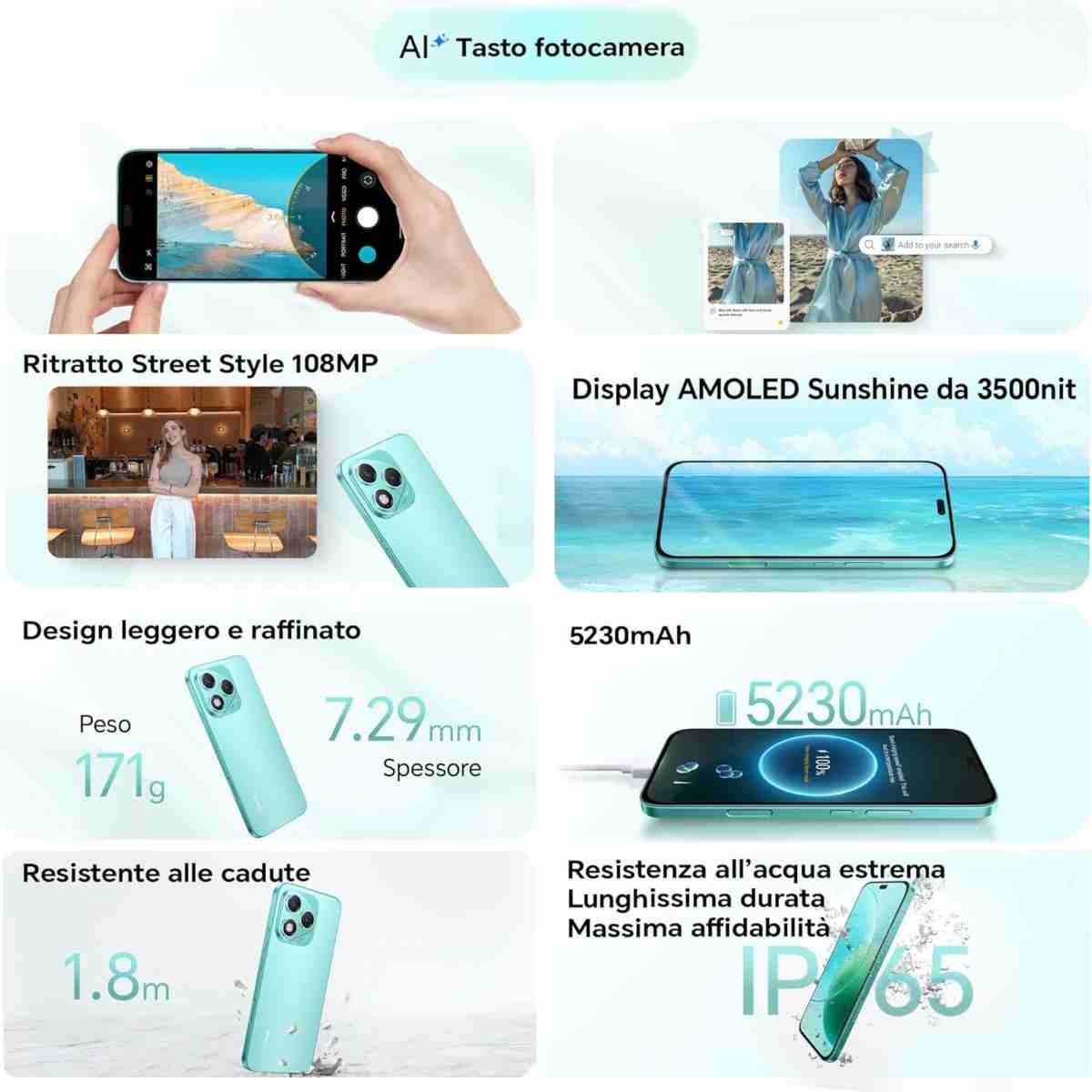 Il corpo di questo smartphone è studiato nei minimi dettagli per avere prestazioni incredibili. Pesa 171 grammi e ha uno spessore si doli 7.29 mm e ha una certificazione IP65 per resistere ad acqua e polvere. La batteria è enorme con 5230 mAh progettati per accompagnarti per tutta la giornata, ottimizzata per l’uso intenso.