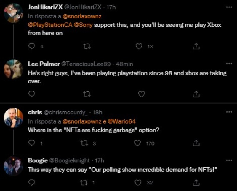 Ebbene con un sondaggio riservato a chi parteciperò all’EVO 2022, un torneo competitivo di Playstation, Sony sta chiedendo ai giocatori a che genere di NFT sono interessati: musica, torneo EVO ecc. I giocatori si sono infuriati e hanno commentato in toni aspri il sondaggio di Playstation. “Dov’è il tasto ‘sono soltanto mer**?’” ha chiesto un giocatore, mentre un altro ha affermato che: “Se lo fanno passo definitivamente ad Xbox!”. Speriamo che l’esperienza degli NFT per Playstation finisca qui. Intanto vi segnaliamo che Xbox ha cancellato uno dei giochi più famosi del momento, e che c’è un’offerta che non potete perdervi.