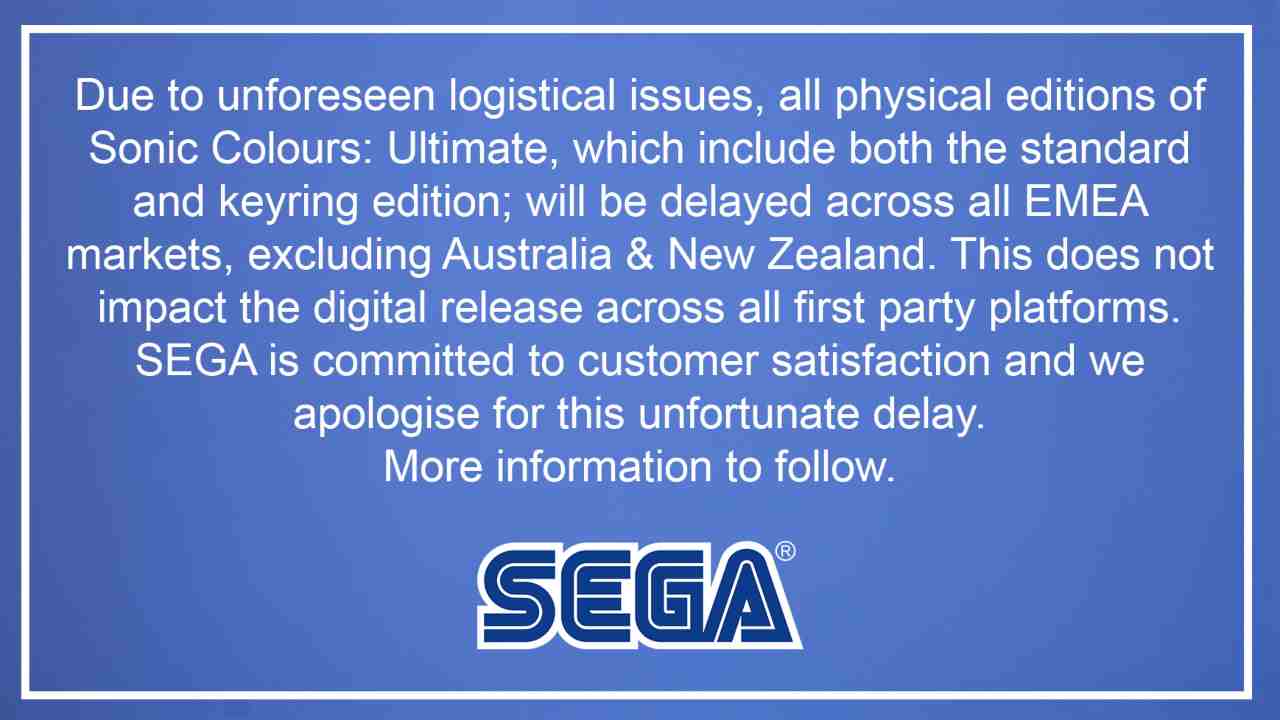 Il messaggio che SEGA Europe ha affidato a Twitter e a Facebook è abbastanza scarno: “A causa di problemi logistici non prevedibili, tutte le edizioni fisiche di Sonic Colours: Ultimate, il che comprende sia la versione standard sia l’edizione con il portachiavi, saranno inviate in ritardo in tutti i mercati EMEA, ad esclusione di Australia e Nuova Zelanda. Questo non influenza il rilascio digitale su tutte le piattaforme first-party“.