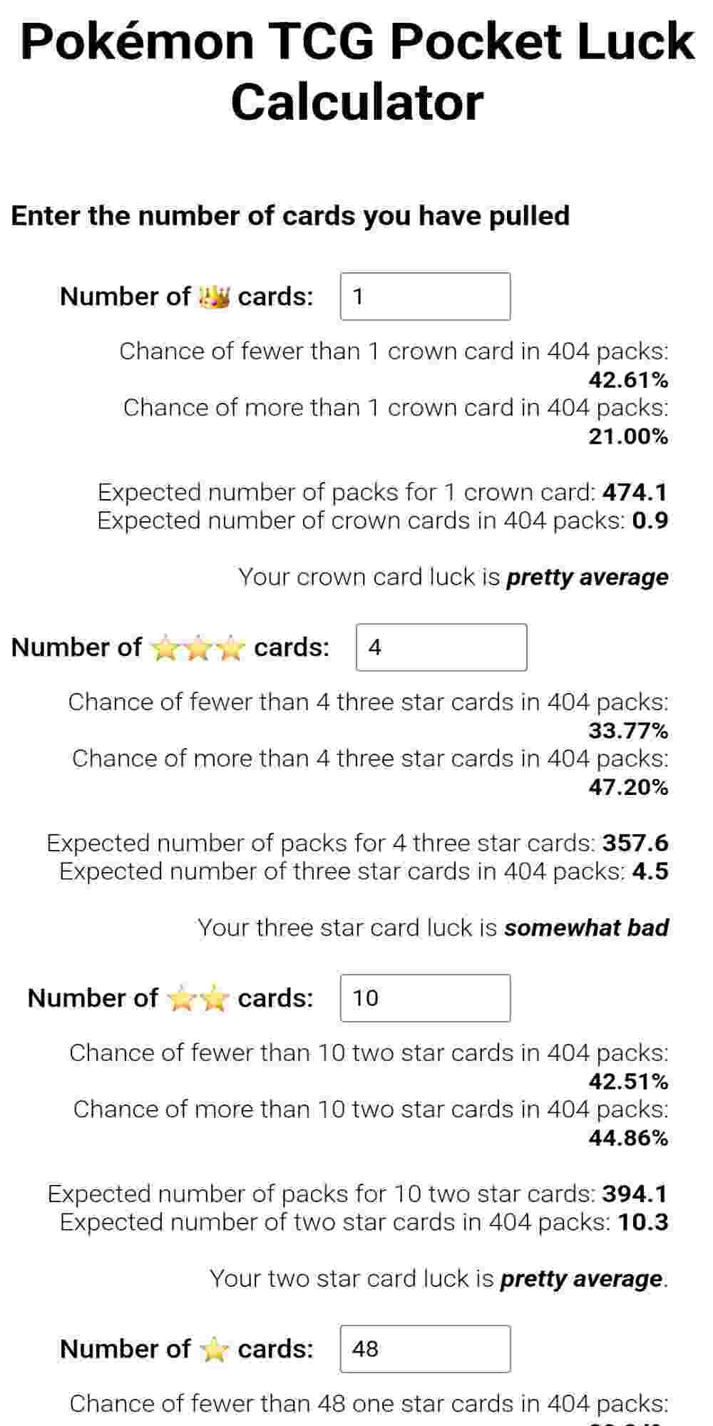 Degli appassionati hanno infatti confezionato un calcolatore di sfortuna di Pokemon Pocket TGC per poter misurare davvero la nostra “prestazione” mentre si aprono i pacchetti. Infatti basterà inserire i pacchi aperti, le carte sbloccate, il numero di stelle e tutta una serie di valori per capire se si è stato o meno sfortunati. Una novità fondamentale per mettere in prospettiva i pacchetti che abbiamo aperto e capire meglio come sia andata davvero.