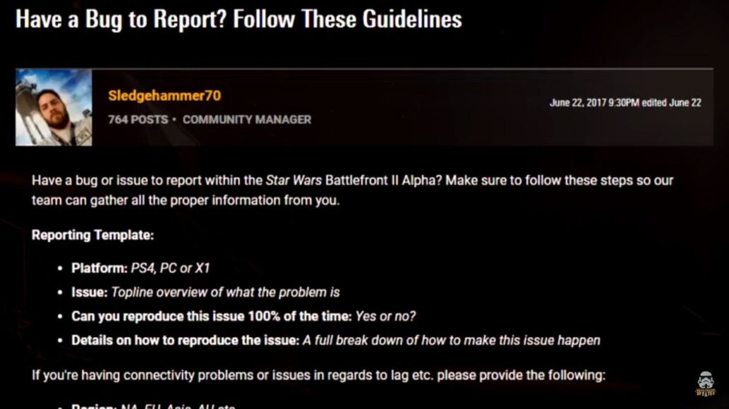 Nel post, che potete vedere immortalato in un’immagine a fondo news, Sledgehammer70 chiedeva agli utenti di riportare bug trovati nell’Alpha di Star Wars Battlefront II, sebbene questa non sia stata (ancora) pubblicata.