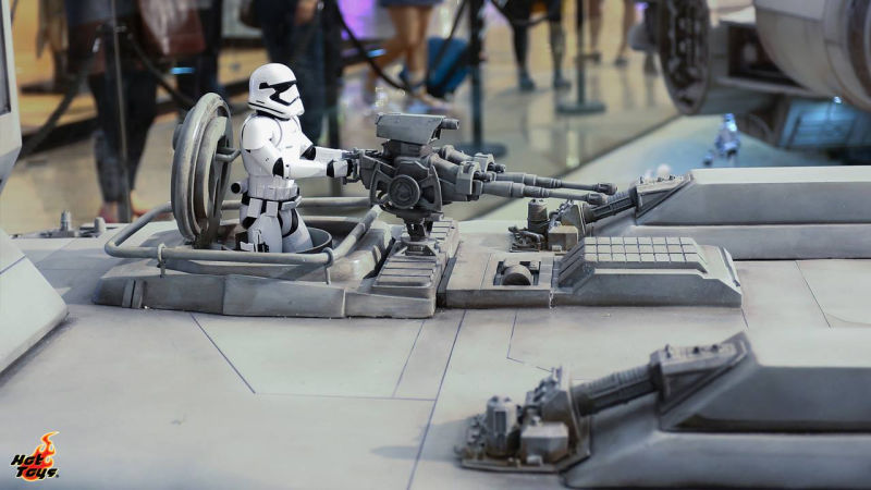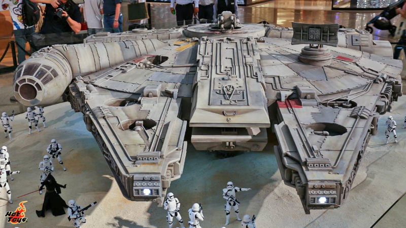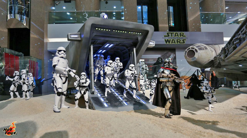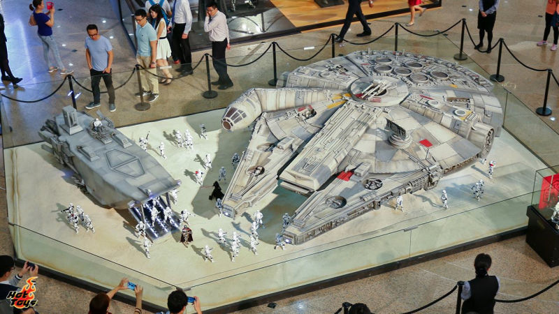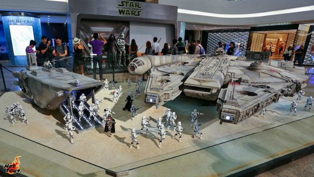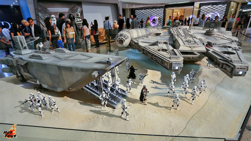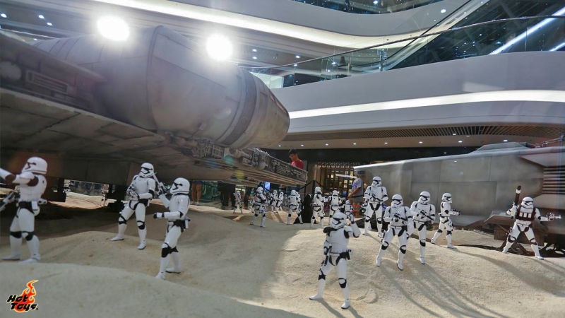 Il Millennium Falcon è il lungo circa 5 m e mezzo ed era stato esibito per la prima volta nel mese di luglio a Hong Kong; ma nelle foto che vi riportiamo qui sotto è accompagnato da uno squadrone di Stormtrooper, ognuno dei cui membri è alto più o meno 30 cm.