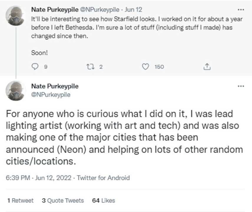 Ad attirare l’attenzione Nate Purkeypile, ex membro del team di sviluppo che nel suo profilo sul social dell’uccellino azzurro si definisce ora sviluppatore indipendente ma con un passato di tutto rispetto avendo lavorato su tre capitoli di Fallout, Skyrim, ovviamente Starfield e altri giochi.