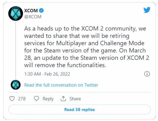 In vista della community di XCOM 2, volevamo condividere che ritireremo i servizi per il multiplayer e la modalità Sfida per la versione Steam del gioco. Il 28 marzo, un aggiornamento alla versione Steam di XCOM 2 rimuoverà le funzionalità.